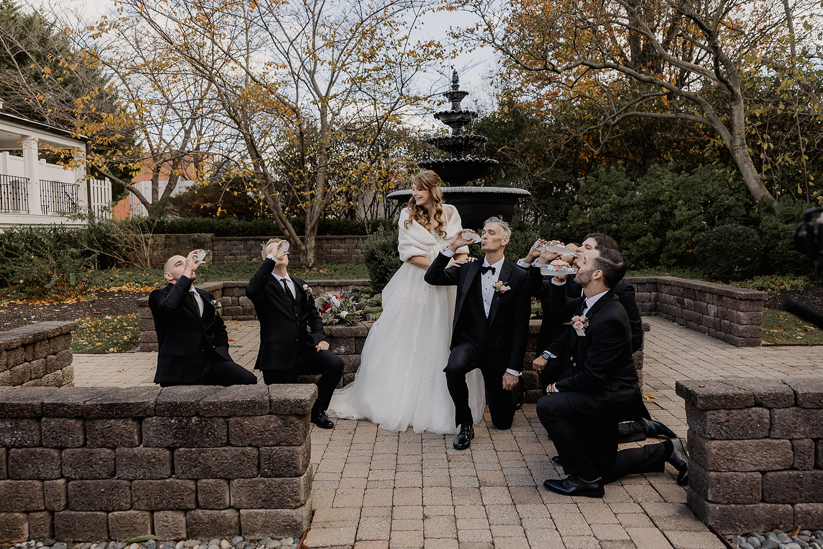 Before the ceremony, Paulina and Mark wanted to get as much of their wedding party and family photos done as possible. This gave them more time to enjoy cocktail hour with their guests later. The bridal party looked perfect for fall, with rich red dresses and classic black suits. Everything felt cohesive, and it was so beautiful against the setting of The Farmhouse wedding venue in Hampton, NJ.